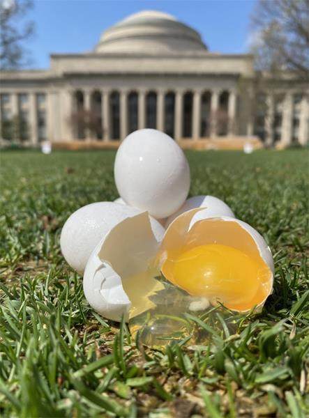 美国麻省理工学院大圆顶教学楼前摆放着做过实验的部分鸡蛋 侧面着地更“抗摔” 如果有人问你:“鸡蛋从高处掉落时,怎样更不易破碎?”也许你会不假思索地回答:“当然是鸡蛋尖头或钝头朝下。”一直以来,大家都是这样认为的。然而,美国麻省理工学院物理学家哈德森·博尔哈·达罗查领导的科研团队最近发表在《通讯·物理学》上的研究结果,打破了这个“常识”。 这群科学家秉持着严谨求实的精神,模拟了常见的课堂科