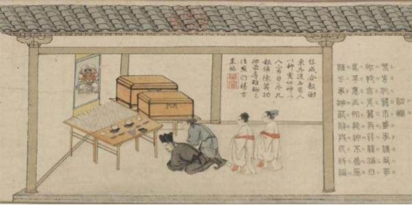 《耕织图》的画面中,有四个人正在进行祭拜。主持祭祀的族长头戴东坡巾,身后两名女子外搭帔帛,洁白如雪的生丝整齐地码放在供桌上,桌案外侧则整齐地摆放着供品和杯箸等。四人正恭敬地向蚕神跪拜行礼,感谢蚕神一年来的庇佑,祈愿来年蚕事顺遂。 《织图二十四首·祀谢》 宋·楼璹 春前作蚕市,盛事传西蜀。此邦享先蚕,再拜丝满目。 马革裹玉肌,能神不为辱。虽云事渺茫,解与民为福。 诗文通过列举与蚕事相关