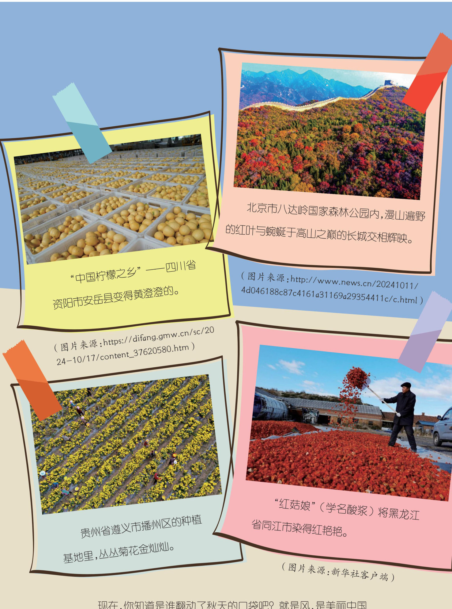 你听,秋天的外套被翻得 哗啦作响。你看,无数“颜料” 从口袋里掉落,落向山河。 的大寨山林场层林尽染。 的风,是乡村振兴的风,是丰收的风,是喜悦的风。