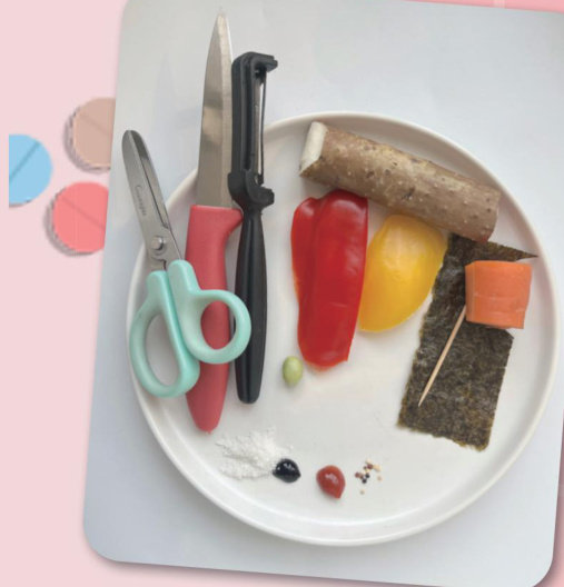 当你哈欠连连地来到餐桌前,看到喜庆又可爱的雪娃娃冲你眨眼晴时,相信冬日早起的困意会顿时全消。来吧,邀请爸爸妈妈和你 一起,动手做一盘雪娃娃吧! 准备材料:白色圆盘、海苔片、山药、焯过水的胡萝卜、蒸熟的红色和黄色彩椒、番茄酱、芝麻酱、椰蓉、黑芝麻、熟豌豆、牙签、熟食专用剪刀、刮皮刀、小刀。使用刀具时,请家长帮忙) 1将山药削皮、切段、蒸熟、压泥。 2 如图所示,分别将黄色、红色彩椒按下图切