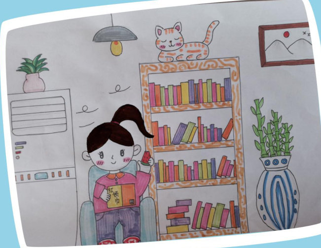 《我的暑假生活》 郑小乐 作者说:这是我根据去年的暑假生活创作的一幅画。我耗尽了心血才画出来的,自认为不错! 点评 真是一幅充满生活气息的画作。画面里的小女孩应该就是小乐本人吧,小编看你惬意地读着书,真是太幸福啦!书架、绿植、小猫和正在呼呼送风的空调,共同打造出一片舒适又温馨的小天地。画作细节生动,色彩明快和谐,展现出小乐对阅读和生活的热爱之情。 美丽中国·红粉在行动”作品展示 《