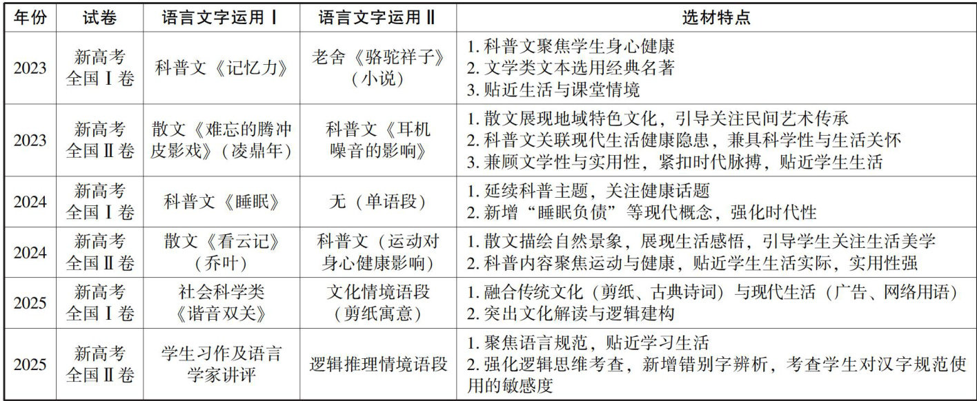 新高考背景下,作为高考语文考查核心素养的关键载体,语言文字运用板块的命题趋势始终备受关注。该板块选材多元、题目设置灵活、考查范围广泛,考无定法,常考常新。要在这一板块实现高效备考,关键在于穿透试题表象,把握其内在规律与考查逻辑。本文试图立足2023—2025年新高考全国I卷、新高考全国Ⅱ卷语言文字运用真题,从“对标明核、随文夯基、因境活用”三个维度,系统探究命题演变规律,进而提出针对性复习策略,为