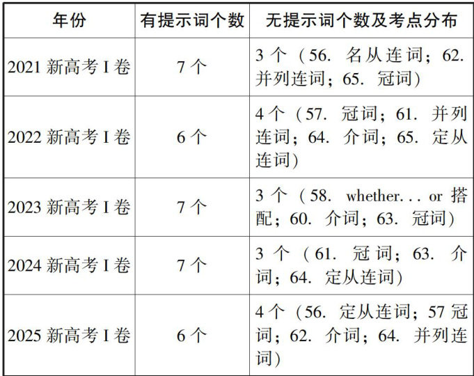 题型分析 高考英语语法填空中的无提示词题目,相较于有提示词题目,对考生的语法知识体系和句子结构分析能力提出了更高要求。考生在此类题目上容易因解题思路不清而失分,因此,系统研究其解题策略至关重要。以下为近年高考真题中无提示词考点的频次分析: 从考点分布来看,冠词为最高濒考点(几乎每年出现),其次为介词(出现频率也较高),随后是并列连词和定语从句关系词(出现次数相近),名词性从句连接词考查相对