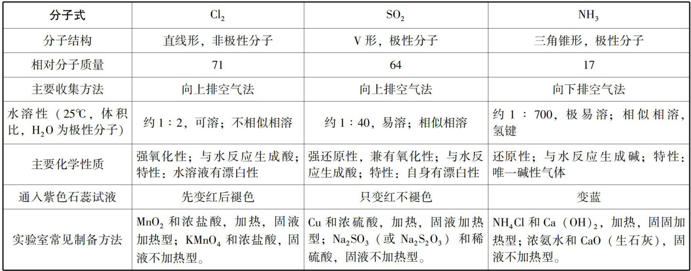 在高考化学试题中(如化学实验题、化学工艺流程题等),有三种核心气体考查频率极高,即氯气( Cl2 )、二氧化硫( SO2 )和氨气( NH3 )。它们分别对应氯、硫、氮这三种重要的变价非金属元素,是元素化合物知识体系中的关键内容。然而,其性质常易被混淆。若想高效学习这些相关知识,利用列表进行系统性的对比总结是行之有效的方法,能使必备知识脉络清晰,一目了然。 一、高考三种核心气体( Cl2 、 S