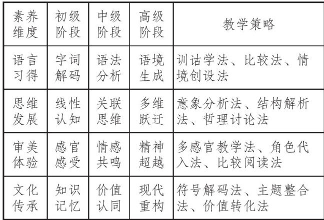摘要古诗词在语文核心素养培育中具有独特的价值。古诗词凝练的语言形式、跳跃的思维特质和丰富的文化内涵,为语言建构与运用、思维发展与提升、审美鉴赏与创造、文化传承与理解四大核心素养的培养提供了天然载体。在具体的教学中,可以尝试构建“四级进阶路径”立体教学模型,使千年诗韵成为激活核心素养的活性载体而非文化标本,为传统文化教育的现代化转化提供实践参考。