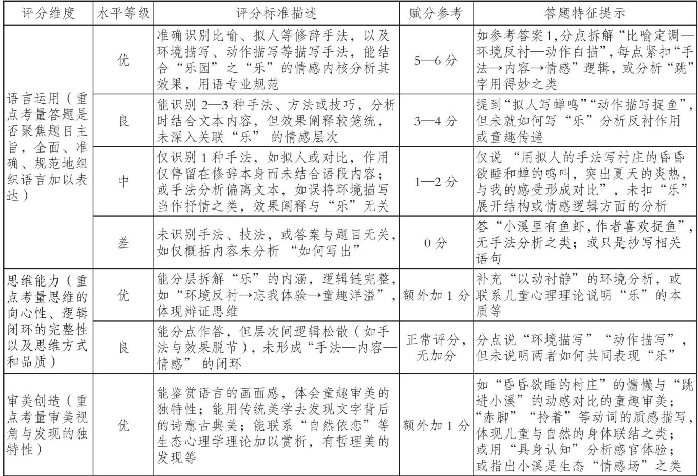 摘要在语文教学聚焦核心素养的当下,评价体系的素养化转型成为关键命题,而命题人参考答案的提供与阅卷点评分手册的研制,正是撬动“教一学一评(考)”一体化的重要支点。“一核四层四翼”评价框架下,开放型、主观性、情境化命题要求参考答案突破“碎片化知识应答”模式,构建指向核心素养发展梯度的解析路径;评分手册需转化为可视化素养量规,以“复杂结构作答”的分层评价,精准锚定学生文化自信、语言运用、思维进阶、审美创造等素养发展水平。当参考答案可作为“素养诊断蓝图”,评分手册能成为“教学改进的参考标尺”,便能实现“以评促学、以评导教”与“依标施教(学)”的深度融合,推动新课标教学评一体化从理念走向课堂实践,让核心素养培育在评价闭环中真实发生。