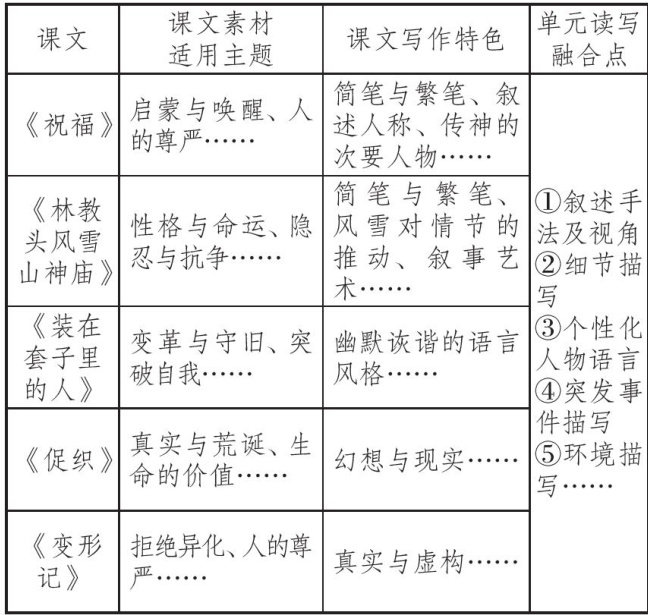 摘要在统编教材必修下册第六单元的学习中,以读写融合的理念为指导,创设学习情境,将单元学习内容与写作训练紧密结合,尝试探索出品鉴、融通、审辩的“读写融合”进阶路径,以促进学生语文核心素养的提升。