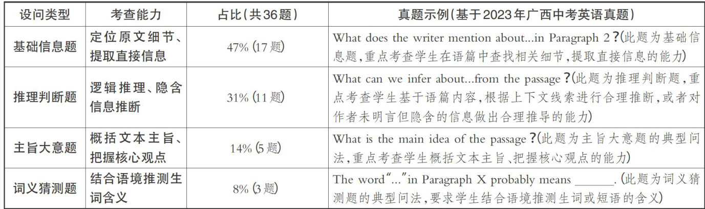 摘要:在省级统一命题的背景下,广西中考英语命题严格依据《义务教育英语课程标准(2022年版)》,实现了从知识本位向素养导向的深刻转变。以广西中考英语阅读理解题型为研究对象,系统分析2023—2025年真题,可以总结出命题的三大特征:主题选材紧密围绕广西本土文化与生态议题;文本体裁趋于多元,议论文比重增加;设问方式更加注重对逻辑推理与深层理解能力的考查。基于对广西多地区教学现状的调研,发现学生在词汇积累、解题策略及文化解读等方面仍存在明显不足。为此,建议教师构建“分层突破 .+ 策略赋能"的双路径培养模式:一方面通过精准化分层教学夯实学生的语言基础;另一方面借助专题化教研与场景化训练,系统提升学生的文本分析能力和解题思维。该模式旨在为教师提供精准的教学改进方向,帮助学生适应统一命题下的考查要求,最终实现阅读理解题解题能力与英语学科核心素养的协同发展。
