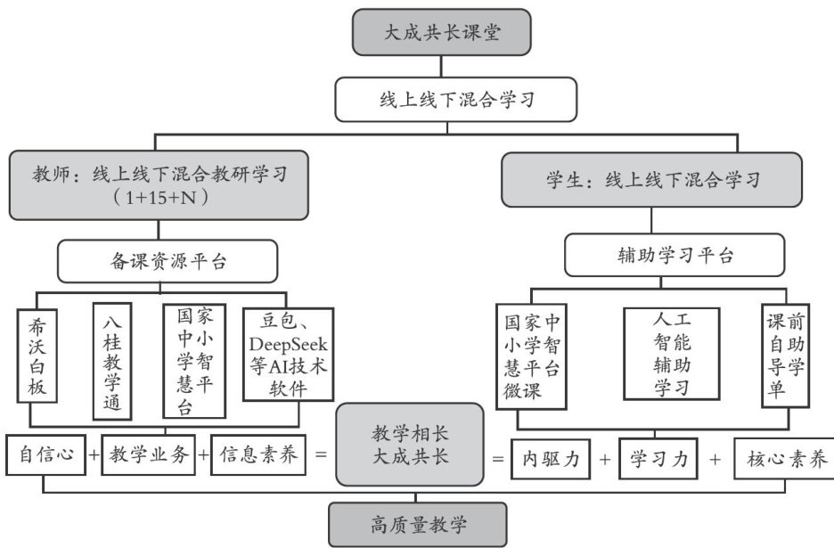 摘要:“大成共长课堂”是基于学生核心素养培育的教学实践,是通过信息技术赋能构建的新型课堂生态。该课堂依托国家中小学智慧教育平台、八桂教学通平台、希沃备课平台等教育数字化平台,组织教师采用 1+15+N′ 线上线下混合教研模式开展教研,引导学生通过“预学一共学一延学”三阶线上线下混合学习模型进行学习,突破传统教学弊端,运用信息技术科学开展学情分析,实现情景化教学,有效提升课堂教学效率,切实发展学生的核心素养。