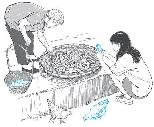 起初只是想教奶奶拍短视频。她那双布满老茧的手,总是握不牢智能手机,食指悬在半空,不知该点哪里。我一遍遍示范如何对准、如何按键,她似懂非懂地点头,眼睛却不时瞟向窗外。 “梅子该收了。”她突然打断我,拉着我就往院子里走。于是,角色被悄然调换。她教我辨认梅子优劣,教我如何用盐水去涩,教我如何晾晒。“晒的时候要翻三次面。”她说这话时,手在梅子上空划过,像在施展某种古老的法术。 我忽然想起什么,掏出