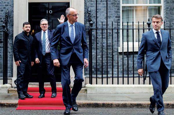 2025年12月8日,英国伦敦,(左起)乌克兰总统泽连斯基、英国首相斯塔默、德国总理默茨和法国总统马克龙在唐宁街10号首相府会谈后离开。图/视觉中国 当地时间1月3日,委内瑞拉总统马杜罗夫妇被美军“绑架”的消息,震动世界。不同于全球南方国家的直接谴责,稍晚些时候,法国外交部长巴罗发布了一段公开声明。他说:“导致马杜罗被捕的军事行动”违反了国际法的基本原则,“法国重申,任何持久的政治解决方案都不能