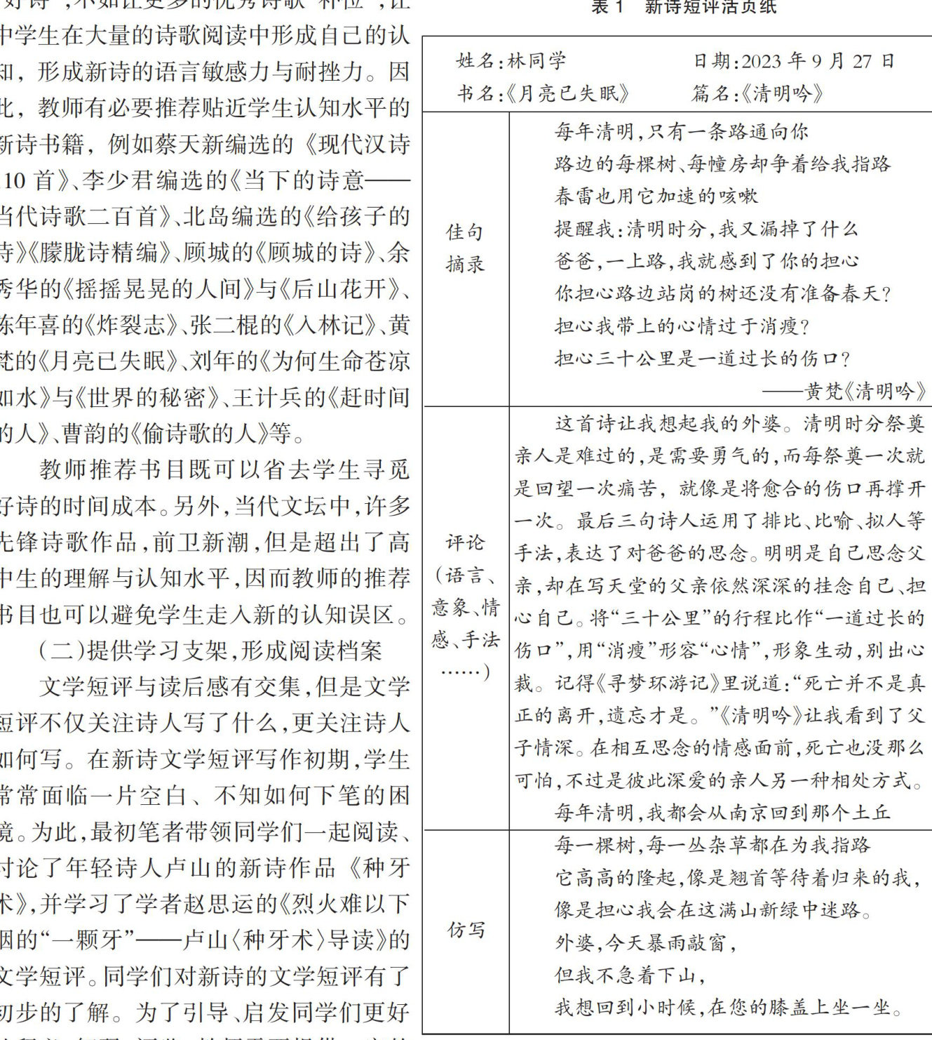 摘要:以文学短评的方式推动现代新诗的阅读与创作,贯通现代文写作与诗歌创作,清晰再现、外化学生阅读新诗的阅读体验、思考过程,拓宽自我创作的诗学视域。文学短评的穿透力与诗歌创作的思想载力如同诗人精神内里一体两面的互文性同构。
