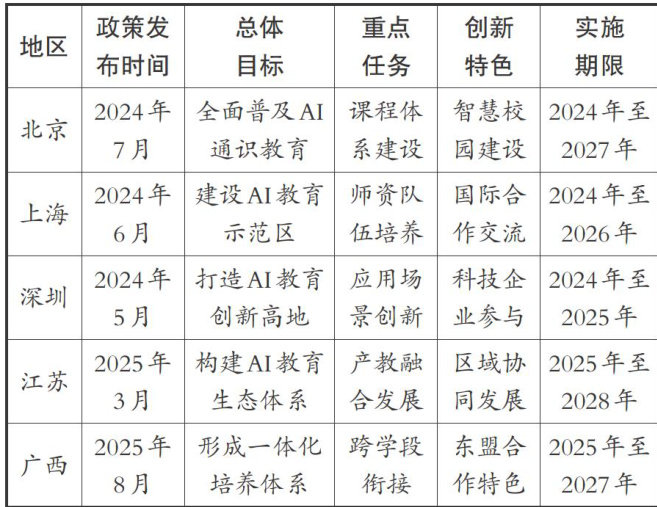摘要:人工智能技术的快速发展为教育现代化提供了重要机遇,构建智能化教育体系已成为各国教育改革的重要方向。该研究通过政策文本分析、对比研究等方法,剖析《广西推进人工智能赋能教育行动方案(2025—2027年)》的核心内容与创新特色,系统梳理其在一体化教育体系构建、人机协同模式创新、区域特色发展等方面的突破性举措。研究发现,广西方案在跨学段衔接机制、东盟合作特色、智慧教育平台建设等方面具有显著创新价值,但在师资队伍建设、技术标准规范、伦理安全保障等方面仍面临挑战。基于此,提出相应实施建议,以期为推动人工智能赋能教育高质量发展提供理论参考和实践指导。