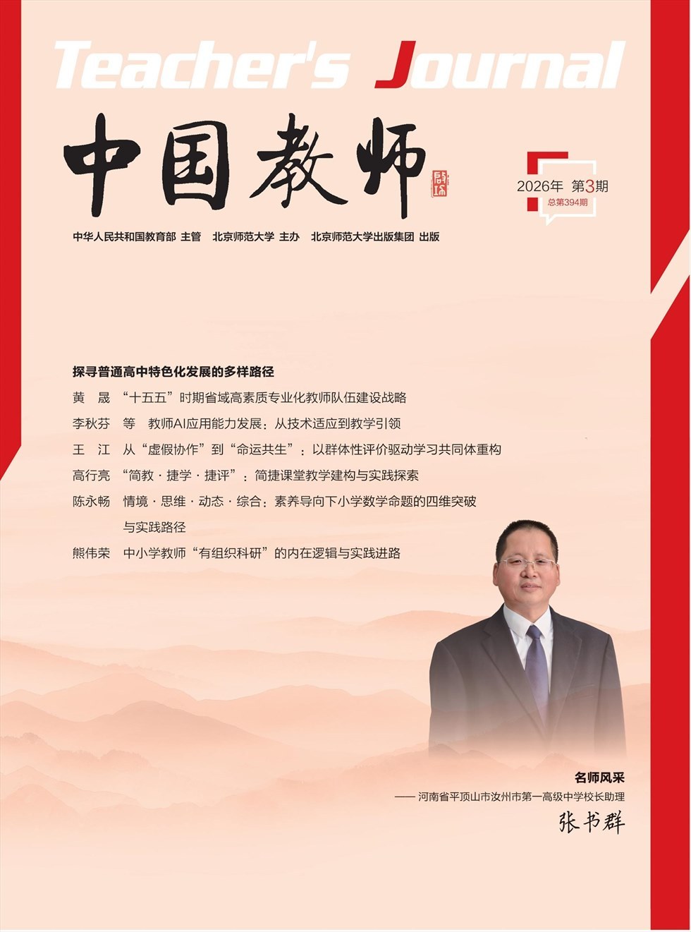 张书群 河南省平顶山市汝州市第一高级中学校长助理,中小学正高级教师,享受国务院政府特殊津贴专家,河南师范大学硕士生导师,河南省人民政府811人才,河南省“豫派实践性教育家”培育对象,教育部“国培”主讲专家;先后荣获河南省政府学术技术带头人、中原名师、河南省教师教育专家等30项荣誉;出版专著11部,发表学术论文10篇,参与编写教材2部,拥有国家专利1项,主持参研省级课题6项。他倡导体验式教学,