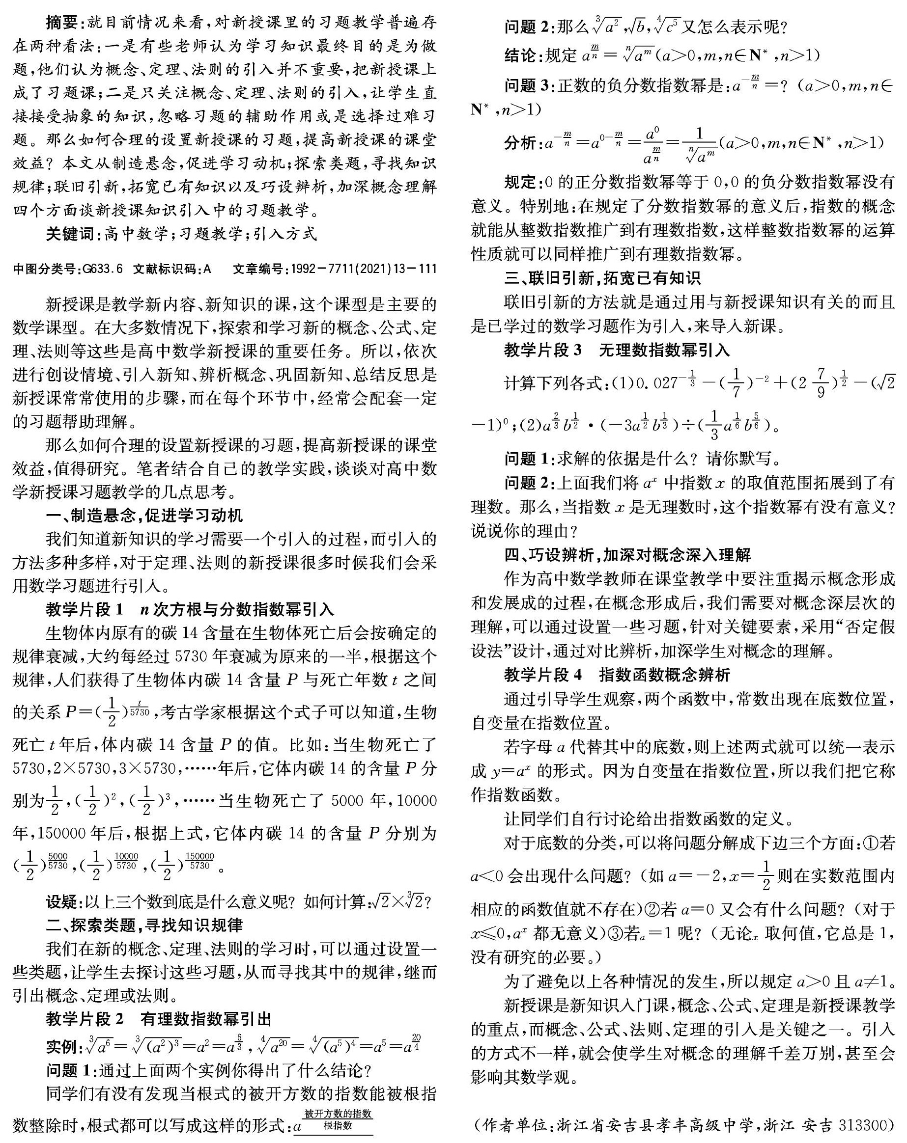 摘要:就目前情况来看,对新授课里的习题教学普遍存在两种看法:一是有些老师认为学习知识最终目的是为做题,他们认为概念、定理、法则的引入并不重要,把新授课上成了习题课;二是只关注概念、定理、法则的引入,让学生直接接受抽象的知识,忽略习题的辅助作用或是选择过难习题。那么如何合理的设置新授课的习题,提高新授课的课堂效益?本文从制造悬念,促进学习动机;探索类题,寻找知识规律;联旧引新,拓宽已有知识以及巧设辨