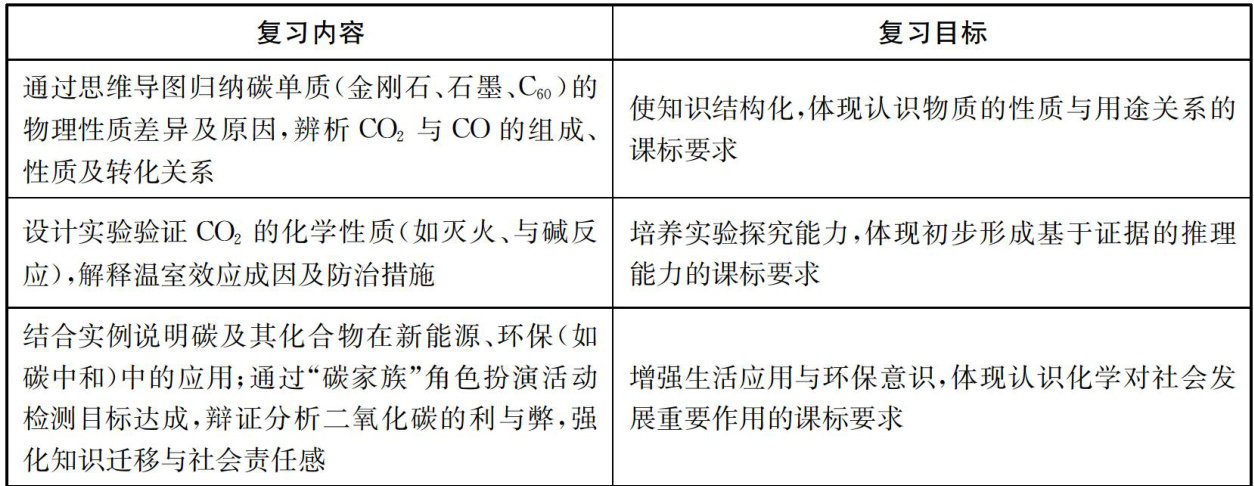 摘要:创设真实的学习情境,开展复习课教学,让学生在真实中学习,可以有效培养学生“适应未来发展的正确价值观、必备品格和关键能力”。结合《碳和碳的化合物》复习课的教学设计,分享一些思考:真实学习情境素材的选择要基于学科知识和学生实际;教学设计主要从内容目标化、目标问题化、问题情境化、板书结构化四个角度进行,追求“五真”的教学效果;将真实情境素材转化为课堂能够使用的教学或问题情境,可以依据素养目标,也可以围绕“本质问题”和“关键任务”。